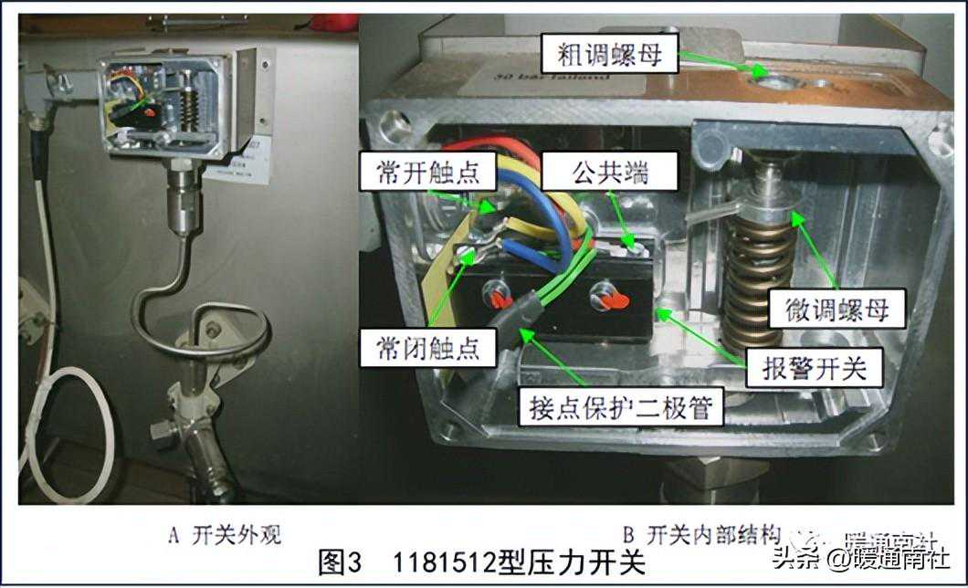 德国I公司的1811512压力开关如图3A所示,开关有一金属外罩保护仪表本体。开关内部结构图如图3B所示,报警设定值的调节通过粗调螺母和微调螺母来实现。