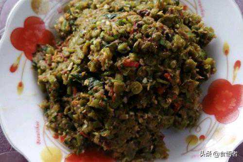 选用豇豆适量,配以青姜、姜叶、大蒜、青辣椒、食盐、味精适量。将豇豆撕丝后洗净,蒸制片刻断生(不必蒸熟),青辣椒烧熟切末,生姜、生蒜拍碎,姜叶洗净切末。豇豆切碎与切末的佐料及食盐、味精一起装入研臼春碎,即可装盘食用。舂缸豆色翠绿,清香素净,细碎易嚼,连无牙者也可食用。味清香,鲜中略带辣味,清凉爽口。