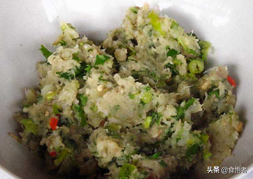 采用牛肉干巴300克,苤菜根200克,用青辣椒、生姜、芫荽、大蒜、食盐、味精适量。先把牛干巴烤熟切碎或切碎后煎熟,青辣椒烧熟切末,苤菜根与芫荽切碎,姜蒜拍松。切好的牛干巴与苤菜根、青辣椒末、芫荽、姜、蒜、食盐、味精同时装入研白捣碎,即装盘食用。苤菜根舂牛干巴质地细软,烤肉香与清香兼融,味美可口,易嚼不燥。