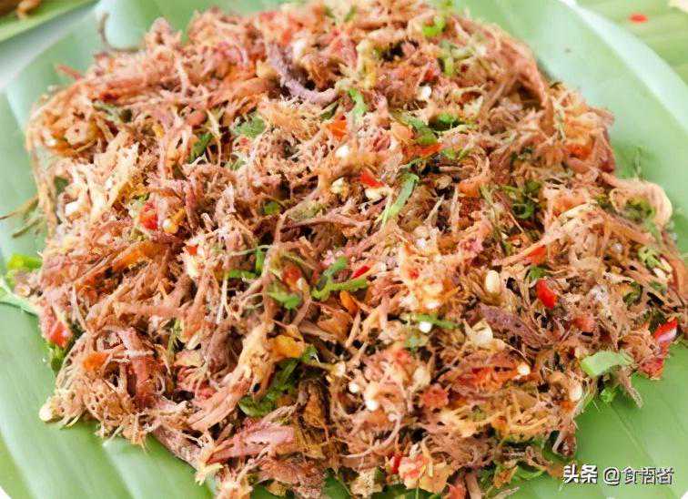 采用鲜鸟肉或鸟肉干300~500克,用姜、蒜、青辣椒、食盐、味精为调料。鸟肉烤熟、烤干(鸟肉干烤熟即可);姜切丝,蒜拍松,青辣椒烧熟切碎。鸟肉切碎与姜丝、蒜末、青辣椒末及少许食盐、味精同时装入研臼捣碎成末,即装盘食用。雀肉松质地细软,烤肉香与佐料清香兼融,气香,味美,易嚼。