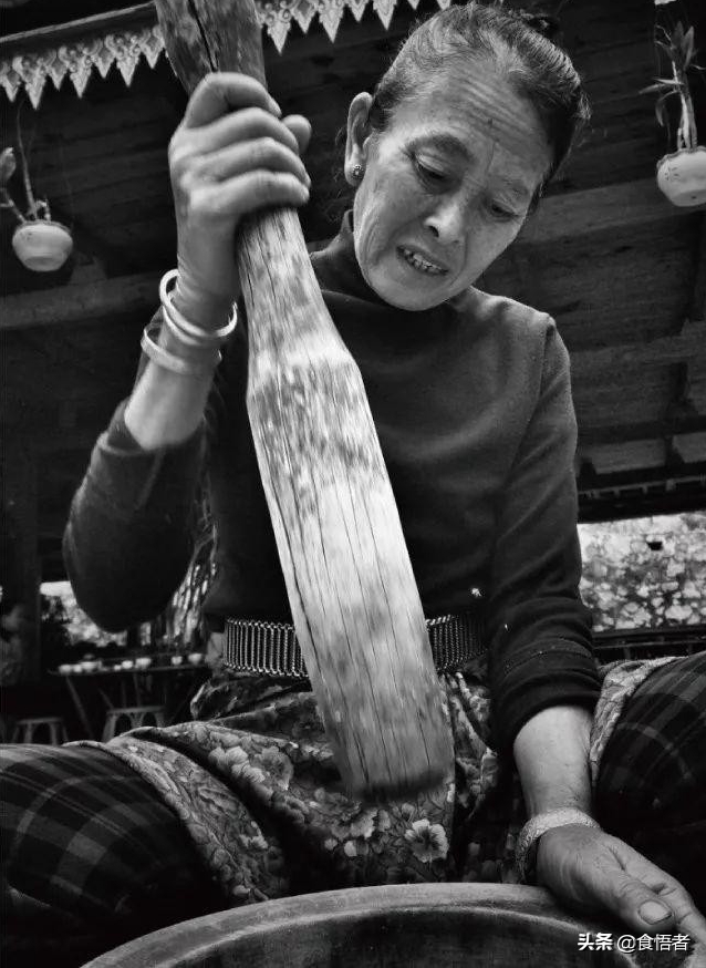 关于舂菜的“舂”,在《说文解字》中的解释为:“舂,捣粟也”。造字本义是指双手持杵,捣搓臼中的谷物,使谷物脱皮去壳。在农耕文明时代,人们用石臼使谷物破碎或去壳的过程都统称为“舂”。世事难料,聪明淳朴的云南少数民族为了“仁爱”,却把这种传统的手工“去谷皮”方式转变为菜肴制作方法。