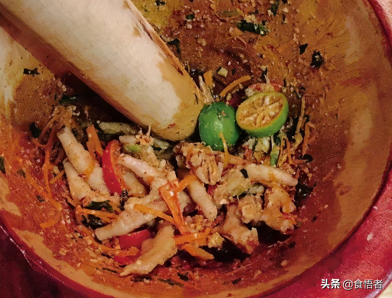 制作这道美食,配料十分丰富,做出的鸡爪,酸辣爽口。鸡脚要煮熟,剪去鸡指尖清洗干净,鸡爪需要对半切开放在有冰块的保温桶里。把蒜瓣放入臼里,再放入小米辣舂碎。然后放入豇豆、洋葱、空心菜舂碎,最后放入鸡脚舂碎,不用太烂。柠檬量要足,把柠檬用挤压器挤出柠檬汁,挤到臼里,挤过的柠檬同样放入臼中。放入各种调料,盐,味精,柠檬汁,辣椒酱,芫荽(当地有两种,大小芫荽),胡萝卜丝,炒熟去皮的花生碎,舂制后有柠檬香味,味道酸爽香辣,口味独特。