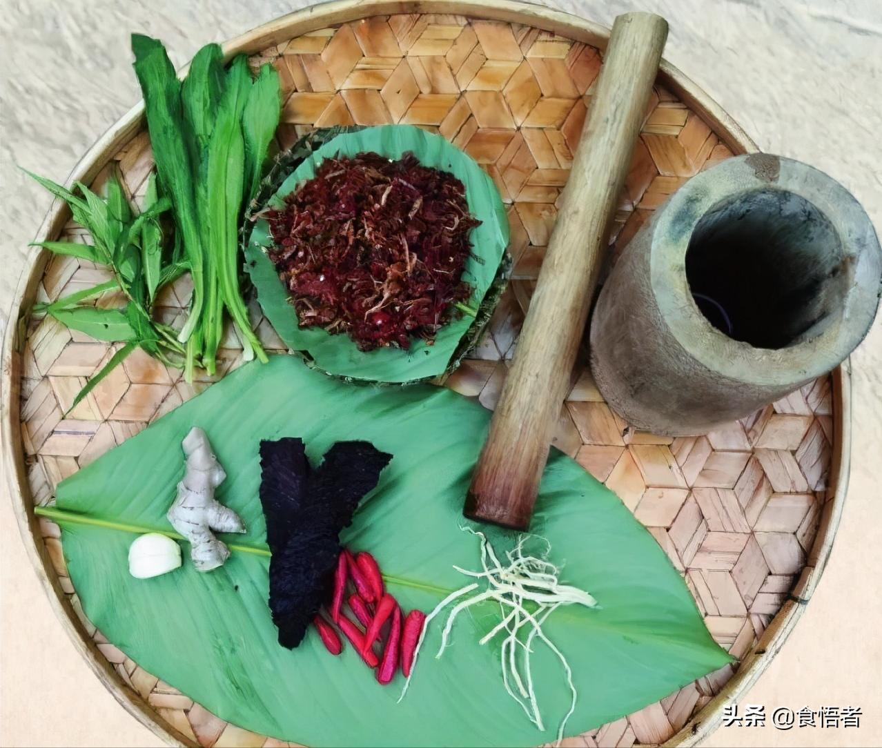 也有人认为,“舂菜”无非不是穷则思变的体现,没有菜肴制作的工具和盛具,就选择一个石头凹凹,食材顺手一放,找根木杵,一敲一打便食,我看非也。舂菜的工具确实简单至极,只需要一根木杵,一个舂臼,各种食材入臼,木杵一上一下,便可捣鼓出一道美味。其实不是我们云南的少数民族没有锅碗瓢盆,这其中还有我们云南少数民族对仁爱的理解和诠释。