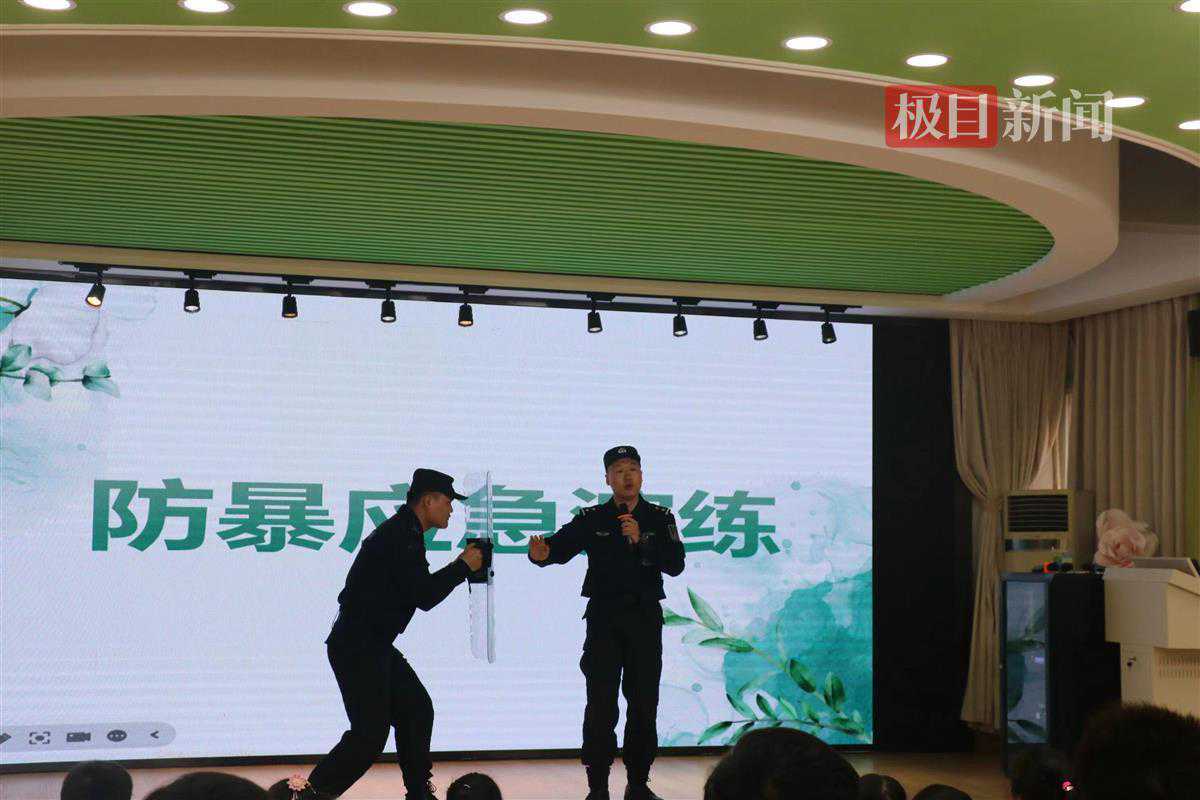 接下来,特警队员们又组织家长护校队、学区保安、社区安全工作人员进行防暴演练,详细讲解了组合防爆器械使用方法和基本的擒拿格斗动作。针对幼儿园女性教职工群体居多的情况,特警黄超特别组织教师开展了女子防身术培训学习,进一步提高了安保防护水平,增强了应对校园突发事件的处置能力。