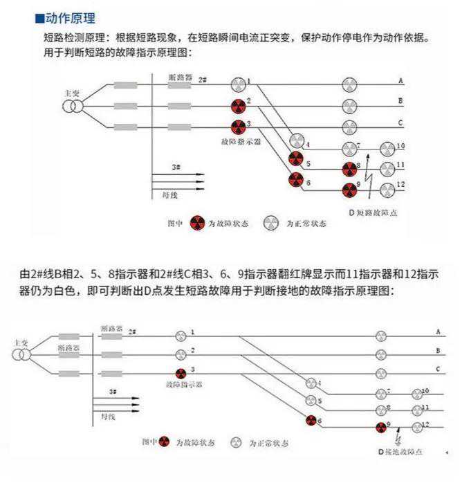 电线中若出现短路电流,电线的电磁感应就突然增大,套装的金属环便能感应出这一变化,线路故障指示器内部的微芯片就能驱使故障指示器动作,故障标志便由白牌翻转为红牌。巡线员可借助指示器的翻牌报警显示,迅速确定故障区段,并找出故障点。