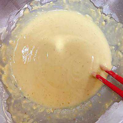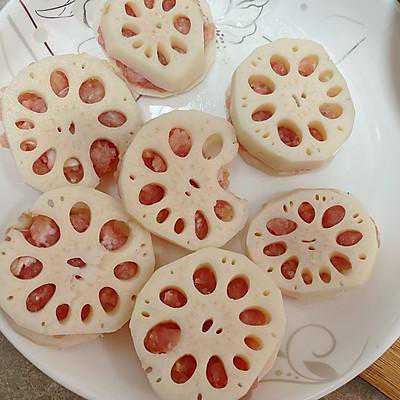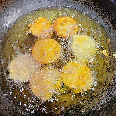 8、将一个个藕夹裹上面糊,一个个放入6成热的油中,中小火慢炸,待两面变成金黄色就可以了
