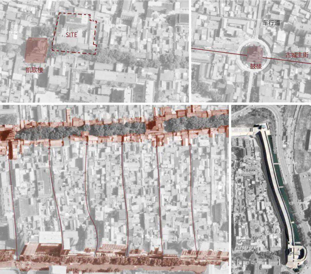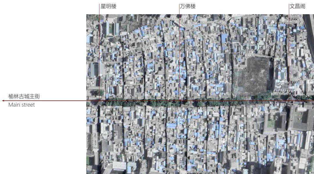 榆林古城大街是整个城市空间布局的主轴线。榆林古城自古作为军事重镇,具有边塞防御系统的空间特征。在城墙内,主轴线贯穿六楼(项目场地旁的凯歌楼为其中一楼),连接南北双塔,其两边的街道呈鱼骨状展开,形成鳞次栉比的卫城巷道。以古城大街为横向或者X,榆林古城的街道则随着纵横或者X、Y两个方向上组织起来,不同层级的纵横街道的组织就形成了榆林古城的空间肌理。随着时间的推移和城市化的发展,城市楼房和交通系统的建设在这座古城的原有肌理下见缝插针地进行,城市空间呈现出错综复杂的状态。