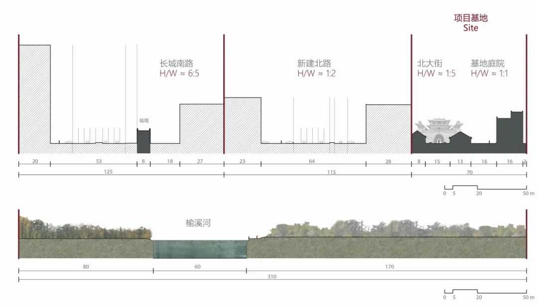 榆林古城的空间布局以主轴线展开并形成交错的纵横关系。若以垂直于主轴线的方向剖开整个城市,一系列沿轴线方向的不同街道尺度的空间被展示出来。由南至北,剖切到的空间依次是宽阔的榆溪河河畔、保留了旧城墙的长城南路、有六车道的新建北路、古城大街、东边连绵的旧城墙以及山脉。榆林古城大街是步行街道,尺度远比车行道与高层楼房创造出来的街道尺度小,也正是因为这种人可以用自身去丈量的空间尺度,古城大街存在着作为公共空间的凝聚力。