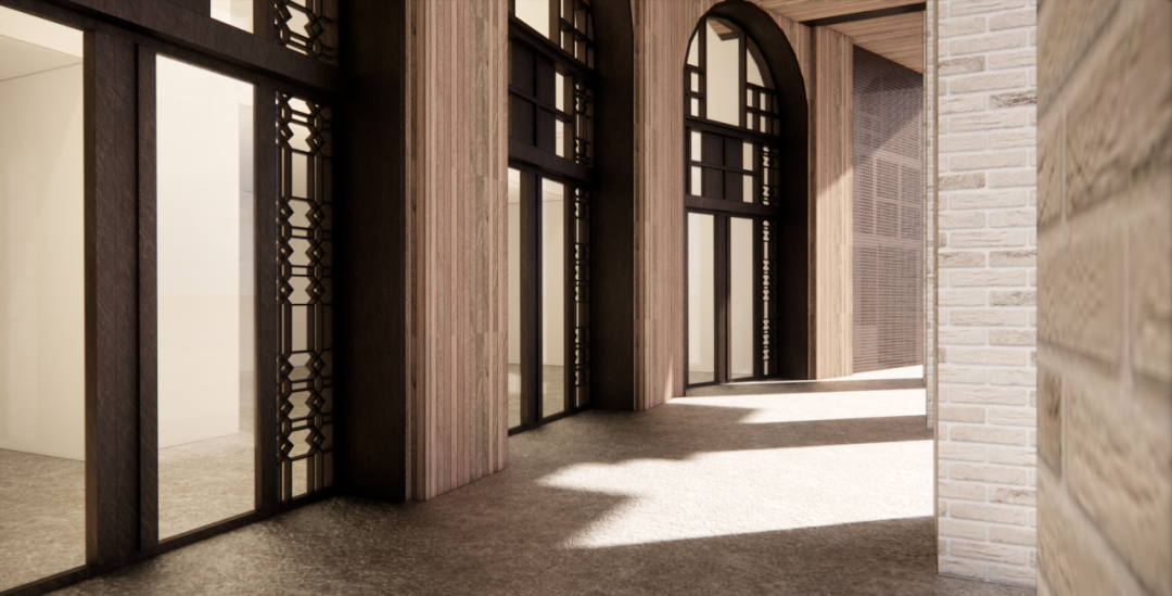 属于城市的立面,则像是是古城肌理的一块拼图,它揭示了与凯歌楼视线关照的联系,同时继承了广域古城中的棕黄色调,以及砖砌的实体肌理。在酒店、庭院、城市三者的相通层级下,一、二层与顶层的棕色的拱洞穿孔板在客房内形成滤光的效果,在庭院内形成阻挡视线的“院墙”,再由斜切安装的方式,形成面向凯歌楼的界面。三层与四层的铁艺栏杆将传统陕西窗花的反转,在相同纹理图案下减少了透光的面积,以形成立面上“实”与栏杆后观景窗的“虚相结合”。陕北传统的砖砌图案与砖砌拱则复刻在侧立面上,与两边的小庭院形成一种静谧的经久的互动。
