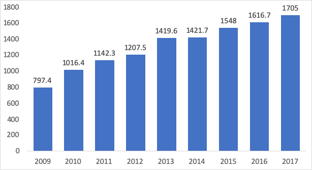 2009-2017年我国水泵市场规模/亿元