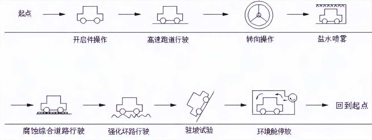 为了尽可能真实、有效地模拟用户实际使用情况,CA-CAP采用最接近用户使用的整车强化腐蚀试验来验证汽车的耐腐蚀性能,设置了高速跑道行驶、强化坏路行驶、腐蚀综合道路行驶(碎石击打和盐水飞溅)等含有多种极端路况的动态行驶工况和具有加速腐蚀作用的盐水喷雾、高温高湿停放等静态停放工况。试验过程中汽车将经受碎石击打、盐水侵蚀、紧急驻坡、石板颠簸、波形起伏等各种极端场景的考验,可以快速有效地暴露汽车腐蚀问题,达到评价汽车耐腐蚀性能的目的。