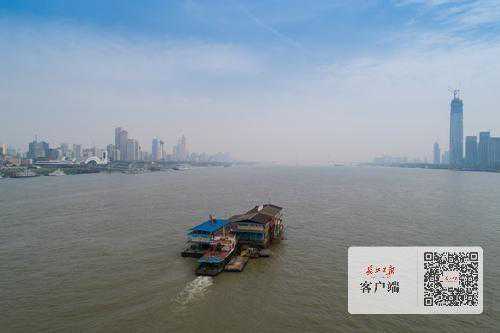3月23日上午,停靠长江南岸鄂航四码头、鄂航五码头的2艘趸船,向长江下游的新洲双柳基地驶去。记者任勇航拍