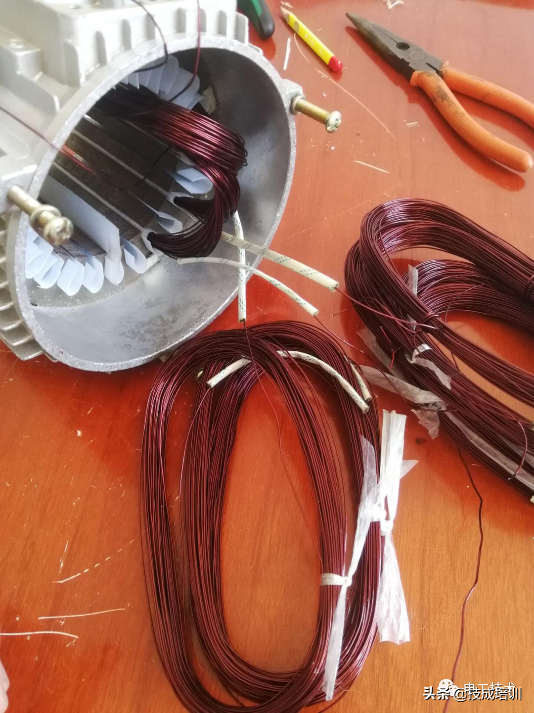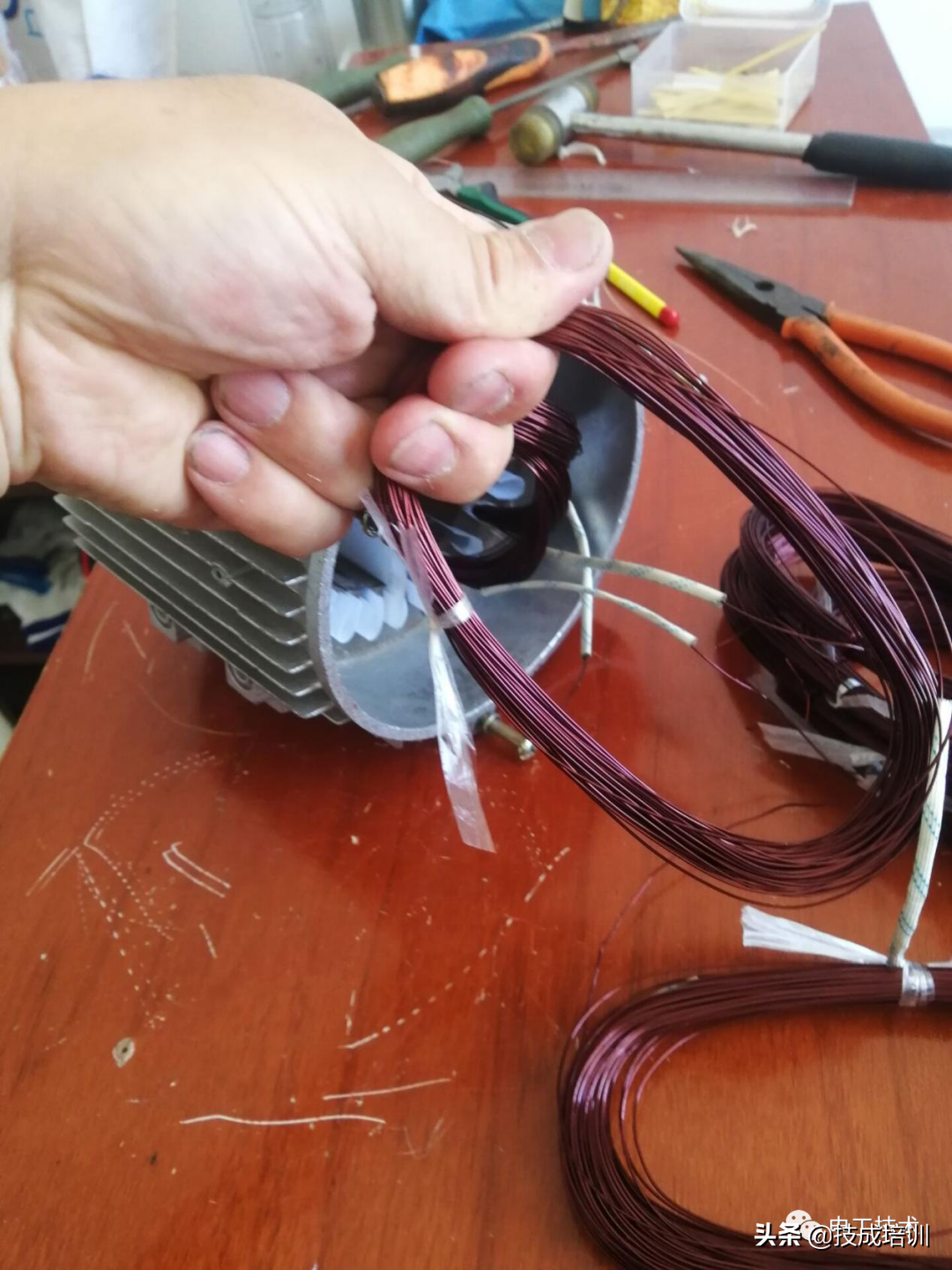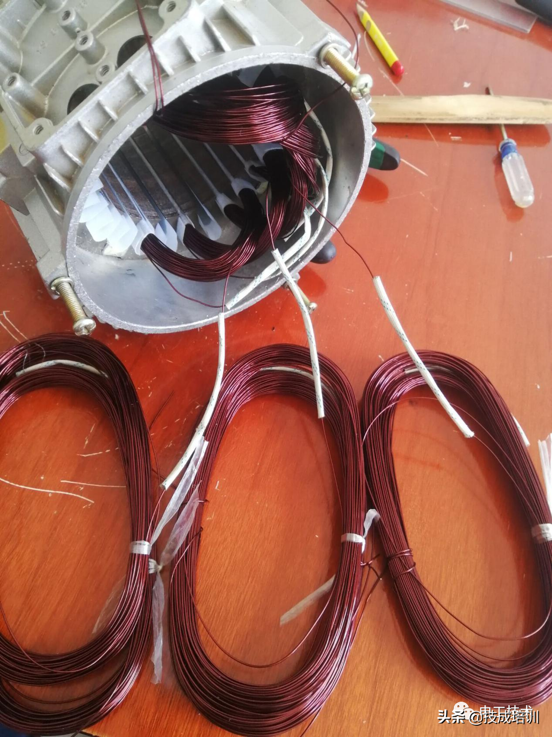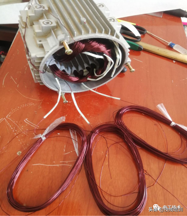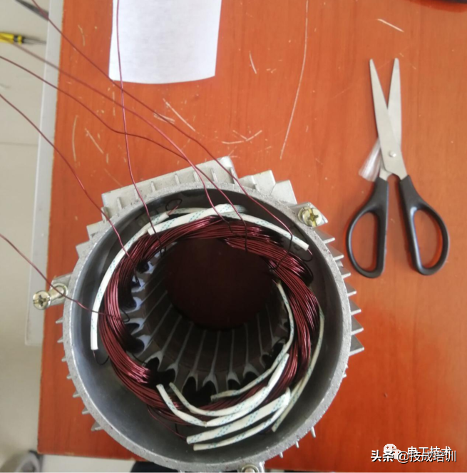 首先在绕线的时候,将绝缘蜡管套在漆包线上,4极电机有4个极相组,就是每相线圈绕4把,每相套3个绝缘蜡管。