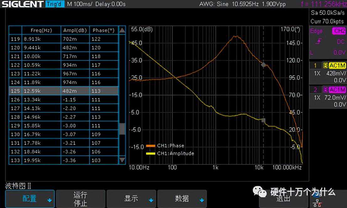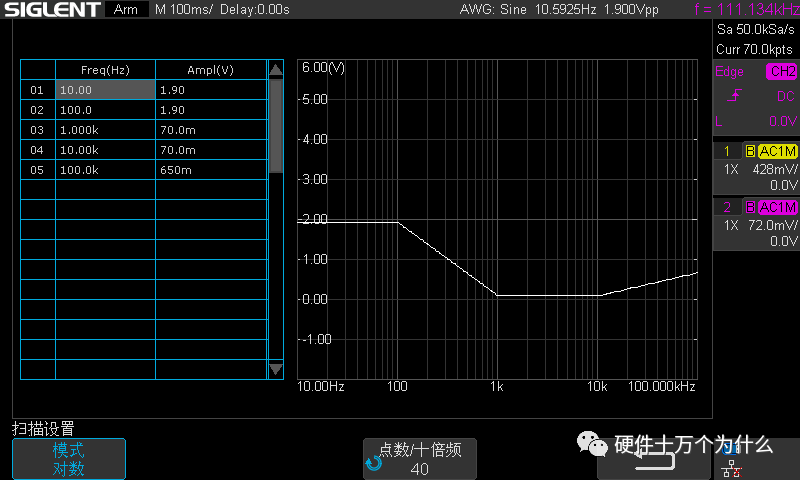 这一小节主要介绍了完成本次测量所需的关键设置,关于BodePlot完整的使用说明,在进入BodePlot软件之前,建议先把要用到的通道设置为20MHz带宽限制。本次测量的频率范围是10Hz到100kHz,这于一个预期的穿越频率在10kHz左右的电路来说足够了。在BodePlot的主菜单按配置信息进入配置菜单,编辑配置信息。进行通道设置,将DUT输入和DUT输出设置到相应的通道上,设置好DUT输入为C1,DUT输出为C2。测试与SAG1021I的连接是否成功。将扫描类型设置为可变幅度,设置扫描参数。将频率模式设置为对数,在配置文件编辑里面建立5个结点,分别是10Hz,100Hz,1KHz,10KHz,100KHz,对应的幅度分别为1.9V,1.9V,80mV,80mV,1V,如下图所示,将点数/十倍频设置为40。