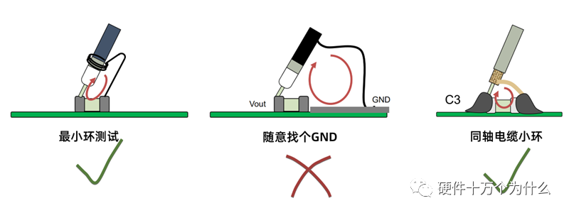 确保测量的回路区域足够小。一般情况下,选择离输出电容越近的测量点,而且连接阻抗越低越好。测量点离电容器越近,在测量过程中产生的噪声越小。