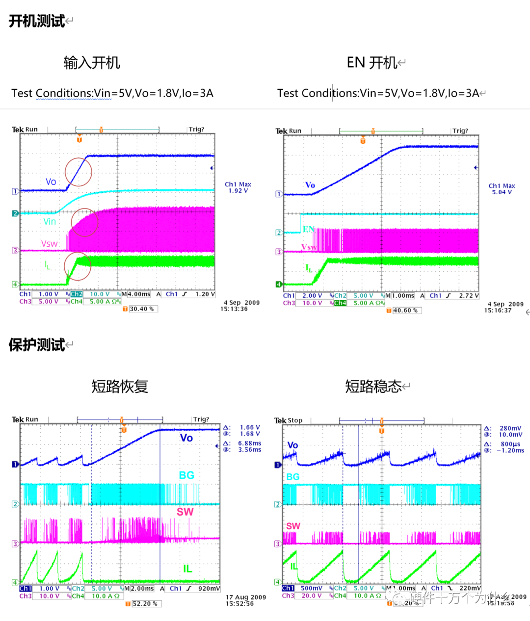2、测试判定方法:外加负载,使得输出电流超过最大输出电流,直到电源输出突然关断,此时输出电流值即为输出过流保护。