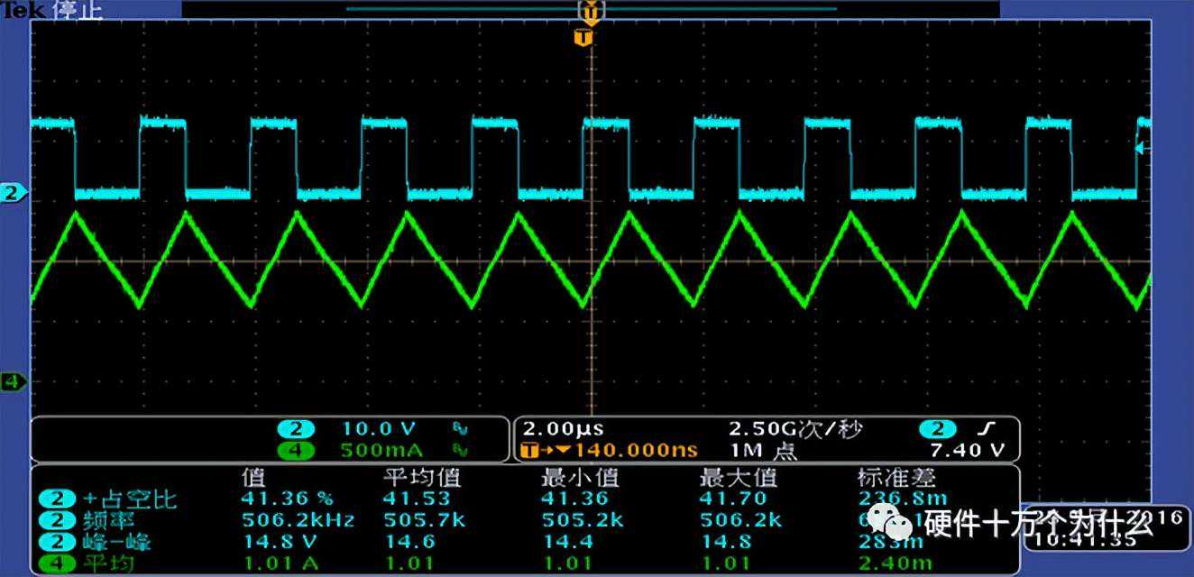 如图所示输出电压的波形,包含开关的纹波,负载跳变的引起的跳变,还有耦合进来的噪声。