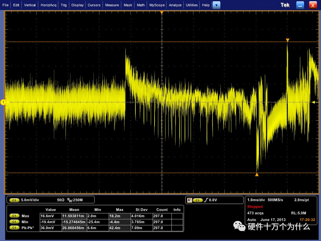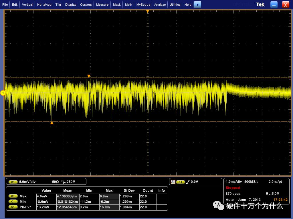 对于实验室高端示波器(如DSA72504D,带宽为20G),测试时带宽下限只能设置为8G,对于电源纹波噪声测量而言,带宽太大容易引入噪声,推荐在1G以内即可,所以对于电源纹波噪声测量,选择1G左右带宽的示波器最合适。