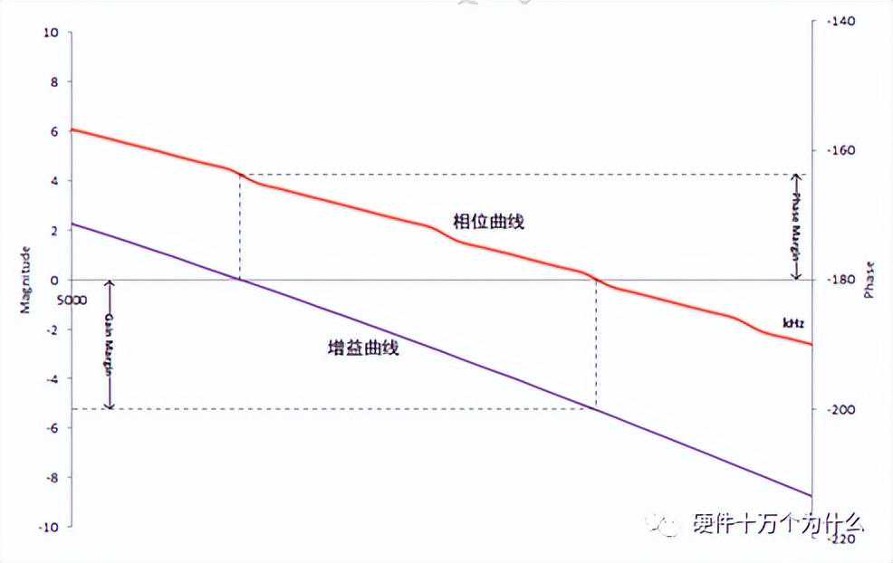 我们可以画出系统环路增益的波特图来评估系统的稳定性,表达系统稳定性常用的增益裕度和相位裕度指标一般就是从这里得出的。相位裕度指的是在增益降为1(或者0dB)的时候,相位距离-180°还有多少;增益裕度则是相位到达-180°的时候,增益比1(或者0dB)少了多少。