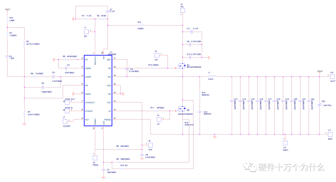 2.2测试接线JWH6346DEMO板是一款稳压电源测试板,上面的电路是用JWH6346同步降压调节器控制器和NMOS管、电感组成的开关电源电路。电路原理图如图。