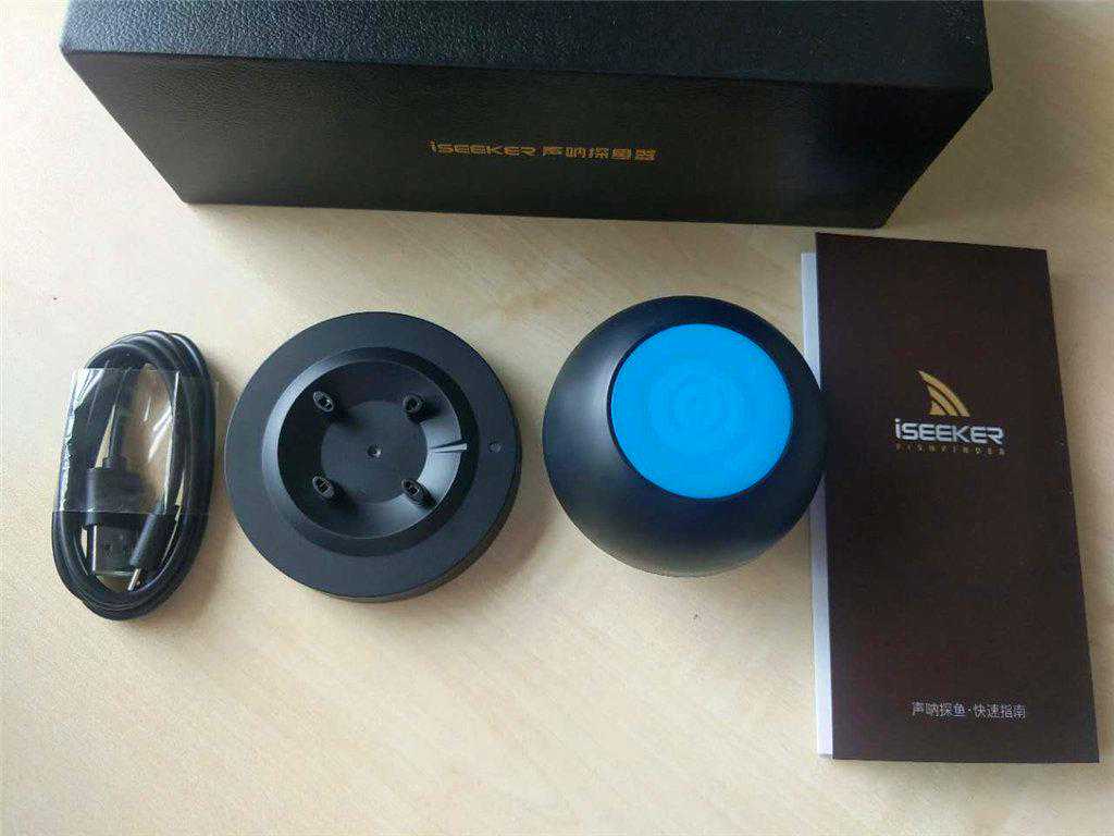 iSEEKER声呐探鱼器的全家照:1个主机,1个充电底座,还有1根USB的充电线。