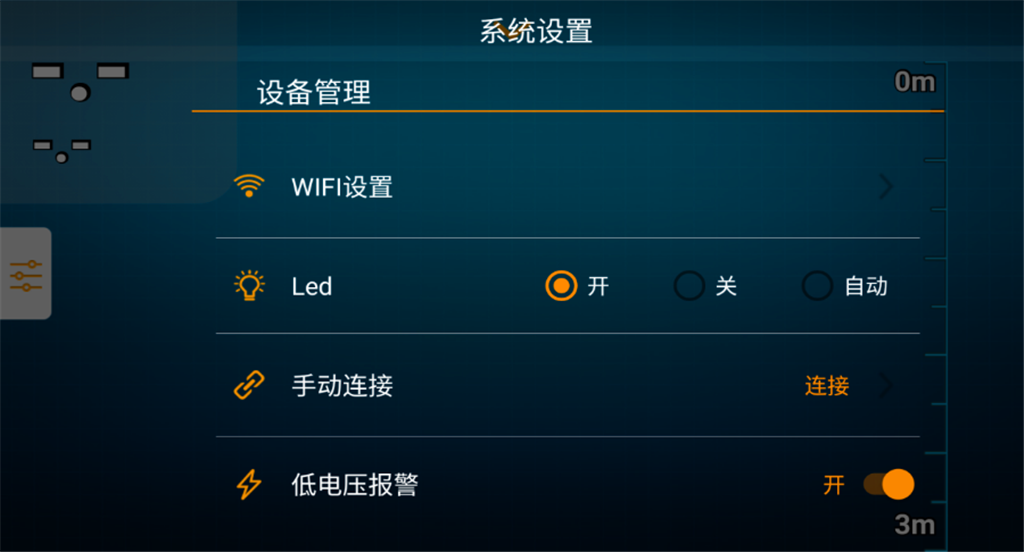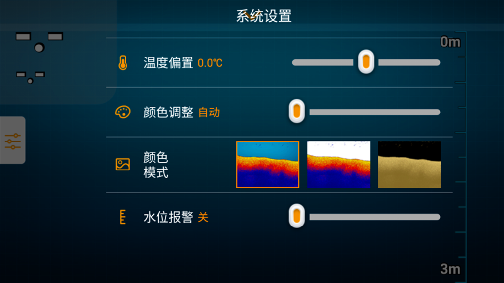 模拟模式打开模拟模式,系统将模拟探测器已连接时接收数据的状态,以方便您在正式探鱼前熟悉各种操作,关闭模拟模式即回到真机状态,另外,关闭模拟模式也用于关闭录像播放。探测器WiFi信号强度指示