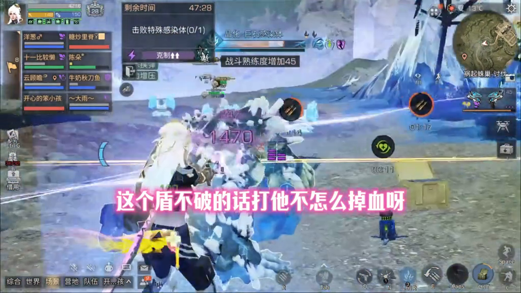 我这伤害够,八百多,一千。进入激化状态了,进入激化状态就可以振刀了。得振它,不振它不行,还是得振它,得把下面那一层盾振掉。这个盾不破打它不怎么掉血。虚弱状态,快打,给它秒了。怎么掉?那么点血,只要破盾之后就秒掉它。还是看振刀,别的都不看,就是看振刀的。不行就得同时振才行。