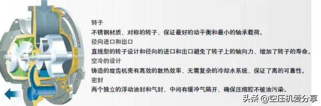 定义:无油旋齿式空压机是由两个形状独特的雌、雄转子构成,转子直接进行非接触运转,通过容积的变化,把气体挤压排出的机器。