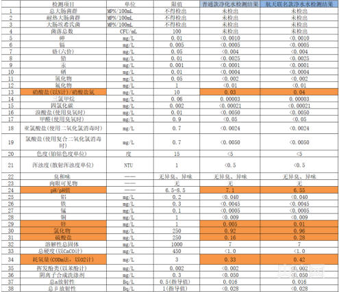 从以上对比图表可以看出,航天联名款净水器在硝酸盐/硝酸盐氮、锌、氯化物、硫酸盐、耗氧量方面的数值均高于普通款净水器,也可以理解为,净化效果弱于或者相当于普通款净水器。