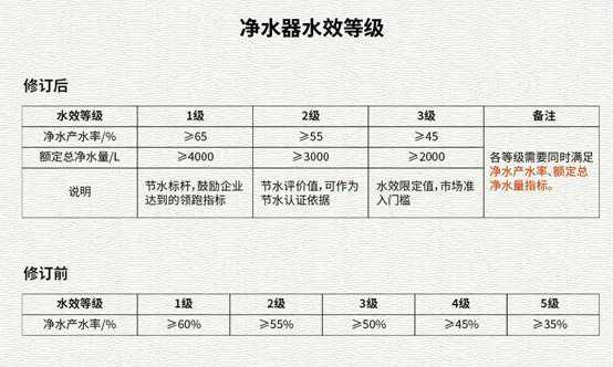 在净水器中,一个重要的指标是水效,即净水产水率,自来水经净水设备过滤后,产生的净水与原水的比值就是该净水器的“净水产水率”,2022年7月1日,新版水效国家标准GB34914-2021《净水机水效限定值及水效等级》正式实施。新水效国标将旧国标的五个水效等级改为3个等级,最低等级的净水产水率要大于等于45%,相比旧水效国标提高了15%,最高等级的净水产水率要大于等于65%。