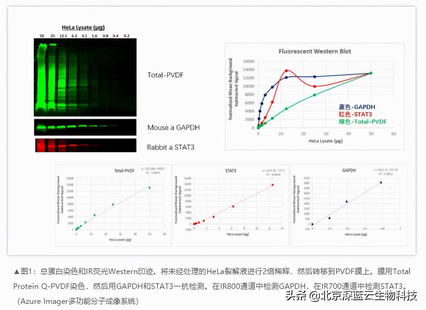 在下面的实验中,加载了0.2-50µg的HeLa裂解物,以检测靶标蛋白STAT3与内参对照GAPDH和总蛋白膜染色的性能。尽管Total-PVDF膜染色线性最高至50μg裂解物,但这显然不是靶标蛋白STAT3加载的理想上样量,因为信号在12.5μg以上不再线性。上样控制GAPDH的归一化提出了一个严重的问题,因为它在裂解物的浓度低于1µg时呈线性,因此其定量用途非常有限。