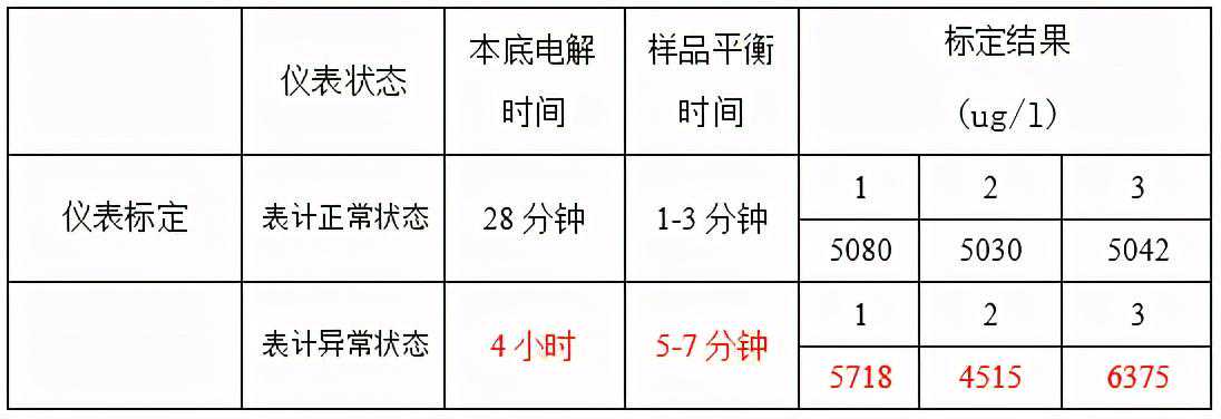 近一段时期,分析人员发现仪器的电解速度在电解的过程中达到0.3ug/L(即消除本底空白值)所需的时间越来越长,从技术标准规定的0.5小时延长至3-4小时。用纯水进行标定时,测定值很难达到1ul纯水=5000ng/l(±5%)的要求(达到此标准值,方可进行样品测量),且标定值的平行性较差。