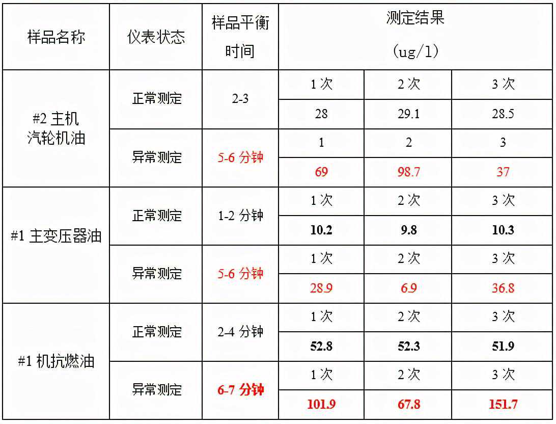 统计结果显示:各种待测样品达到平衡点的时间明显延长(测定时间长),测定结果与以往监测结果相比相差较大,且多次测定结果之间的重复性较差。显而易见,仪表在此状态下即的测定结果无法保证测定结果的准确性。