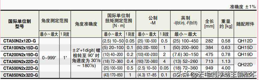 为了满足在使用时各种需求,日本东日数显扭力扳手有一个系列是带角度式的,那就是CTA2-G系列,这款角度测定范围0~999°,角度准确度是±2°,各单位扭矩测量范围,刻度小至0.05,可根据规格选择合适的型号。