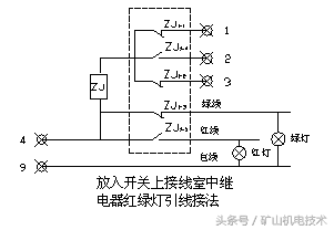 此种方法在开关内部利用开关本身或中间继电器上节点引线,以达到红绿灯随绞车开关的起动而变化。