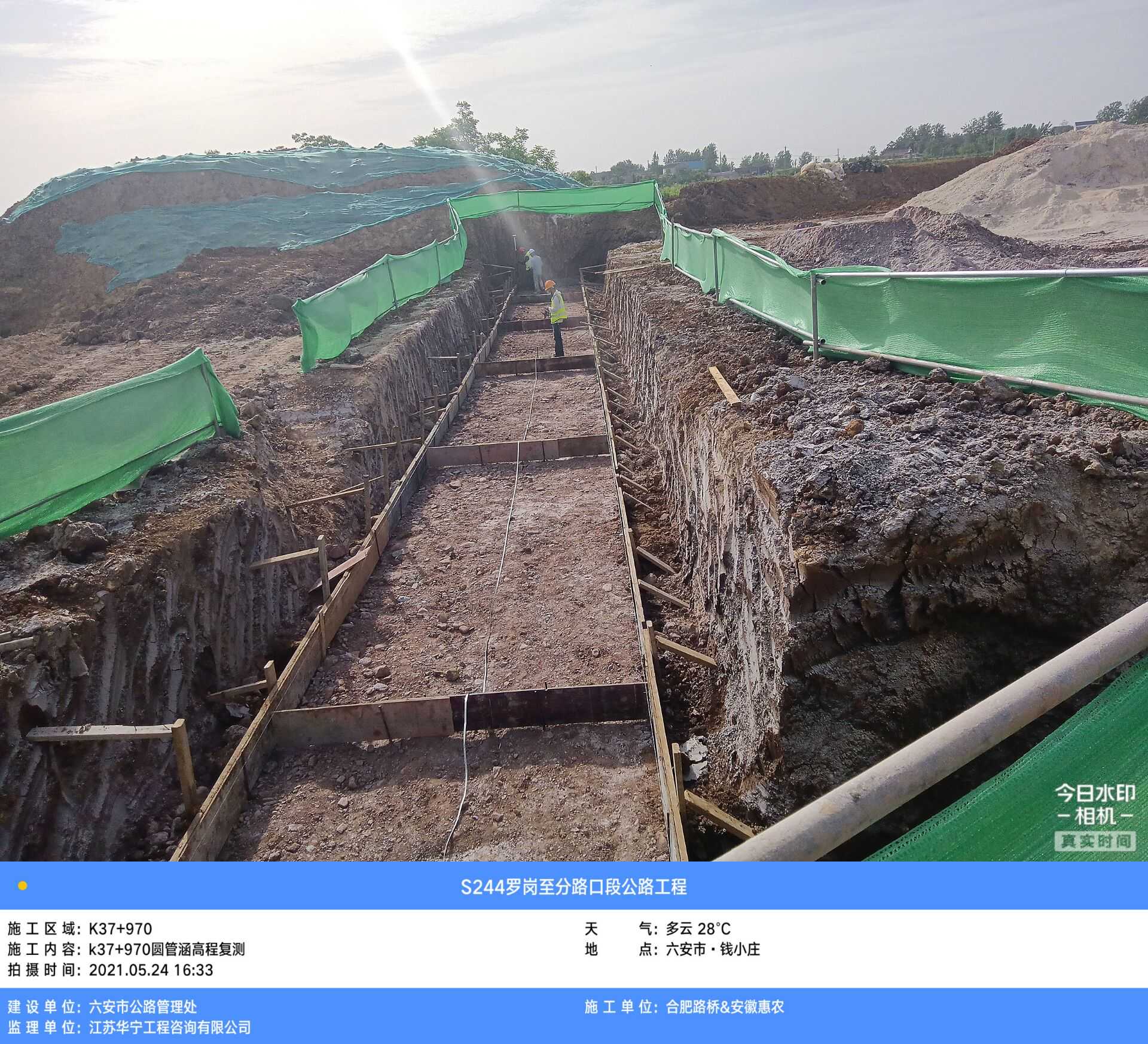 采用人工配合机械开挖,沿涵洞基础宽度每侧放宽30cm放坡1:1开挖基坑,机械开挖至距涵洞需换填基底标高10-20cm处,然后人工清底。注意不得超挖扰动原状土,整平夯实之后需检测基底承载力是否满足要求。