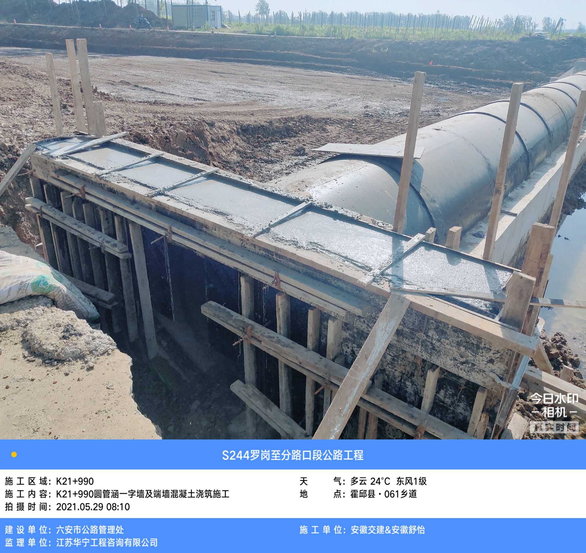 基坑检查合格后,即可进行圆管涵基础施工,先在基底用砂砾进行封底找平,再在砂砾底面上用全站仪放样出涵洞轴线,定出立模边线和每个沉降缝位置。模板除锈后进行刷油处理,以利于脱模。模板后加设钢管支撑,支撑应结实牢固,保证浇筑砼时模板不变形不跑模。测量模板顶标高,确定砼顶面位置并在模板上做好明显的标记。
