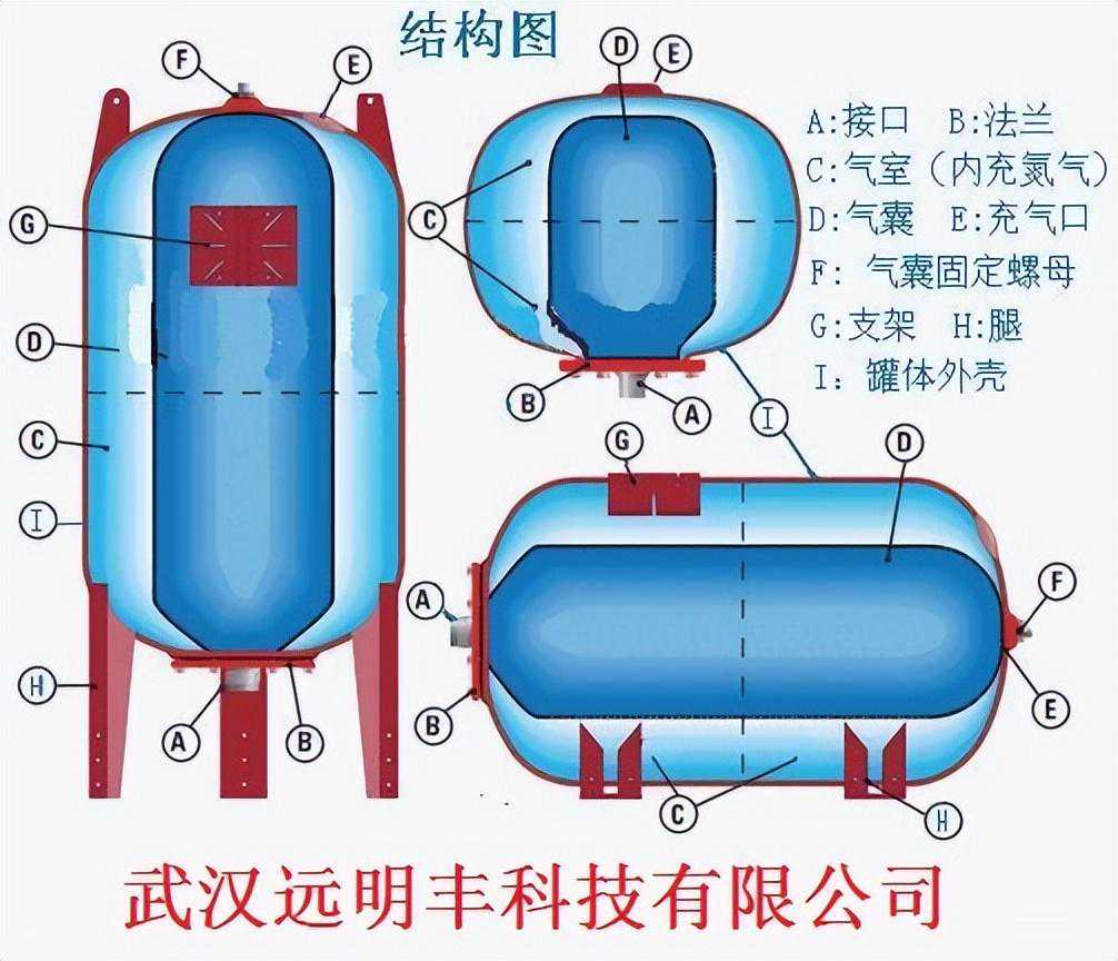 气囊式膨胀罐在结构上有了长足的进步,克服了以上缺点,如图: