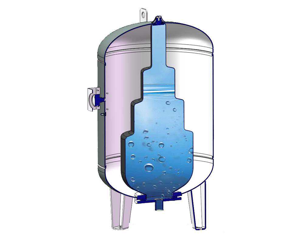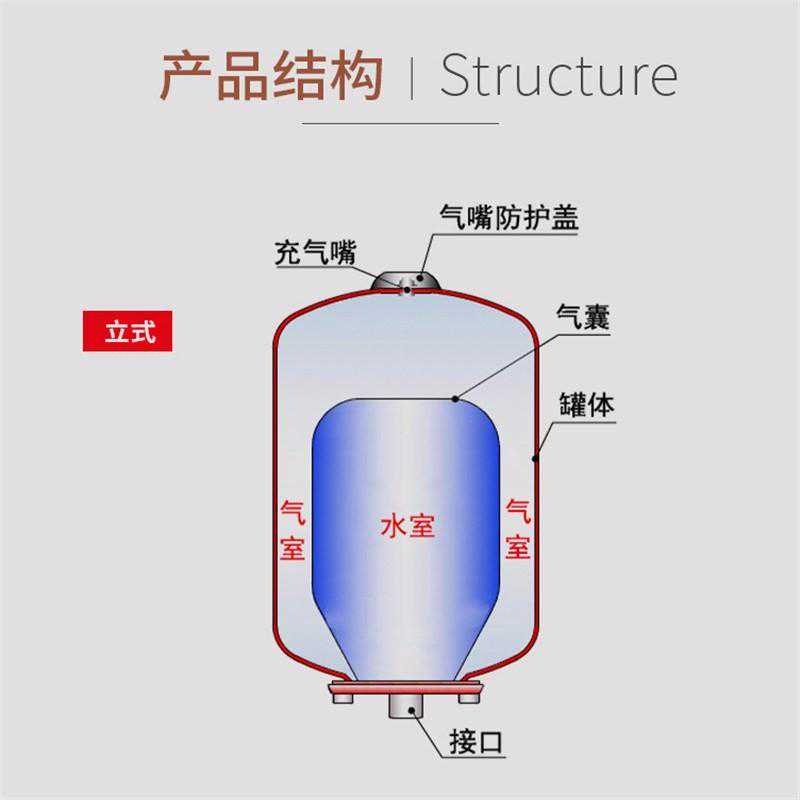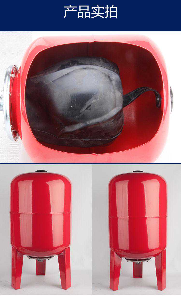 气囊式膨胀罐内部有一个整体的气囊,在工作时水只进入气囊内,不与壳体接触,接口处用法兰盘连接,避免了焊接过程引起的生锈问题,罐壁不跟水接触,避免了生锈可能和水质的二次污染,使用寿命长,而且这种结构的膨胀罐即使气囊损坏也可单独更换,避免了隔膜式膨胀罐隔膜破裂后整个罐子就报废的问题,同样,由于是法兰联接,故它的接口就可以承受很大的扭力,在安装过程中就不怕会扭断接口。