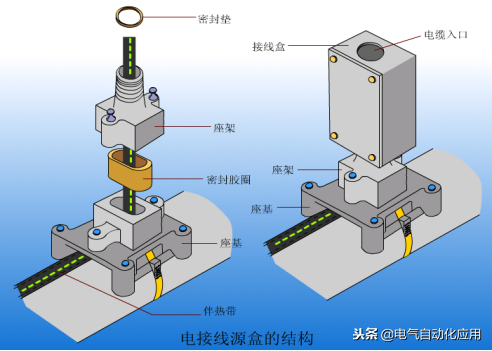 在电伴热带的末端必须装有密封端子,使电缆芯线免受潮气侵蚀,并与带电导体隔绝,安装时,应避免密封端子和分线盒浸入液体中。密封端子的结构如图所示。