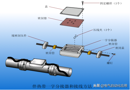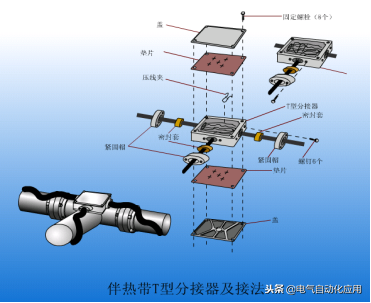 电伴热带的中间分线盒有“一”字型和“T”字形两种,分线盒的作用一是在管道分支时,电伴热带也随着分出支路,二是电伴热带出故障时,方便故障点的查找和确定,便于更换某一段电伴热带。中间分线盒的结构和接线方法如图所示。