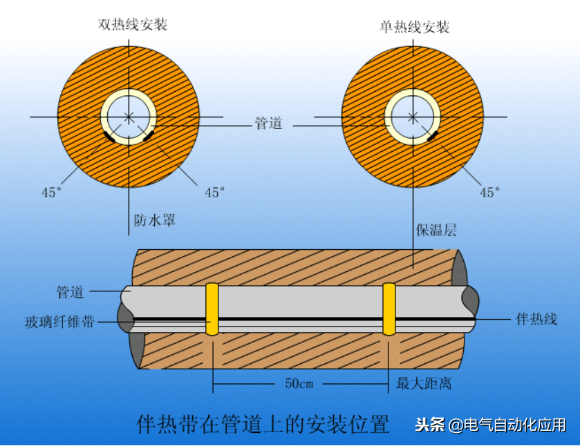 使用的电伴热带一般为自限式电伴热带。这种电伴热带可以使电伴热管线上的每一点随着周围温度的变化而改变发热量。温度升高时,电伴热带可以自动降低发热量。温度降低时,电伴热带可以自动提高发热量。这种自控性可以随时补偿温度的变化,避免电伴热带过热或发热不足。