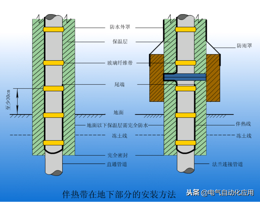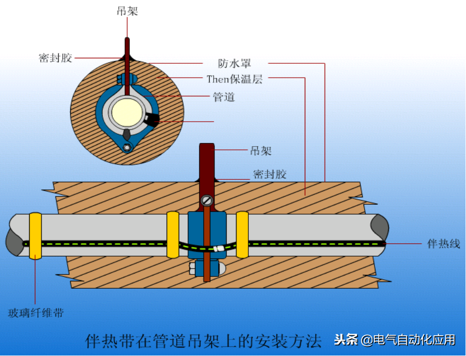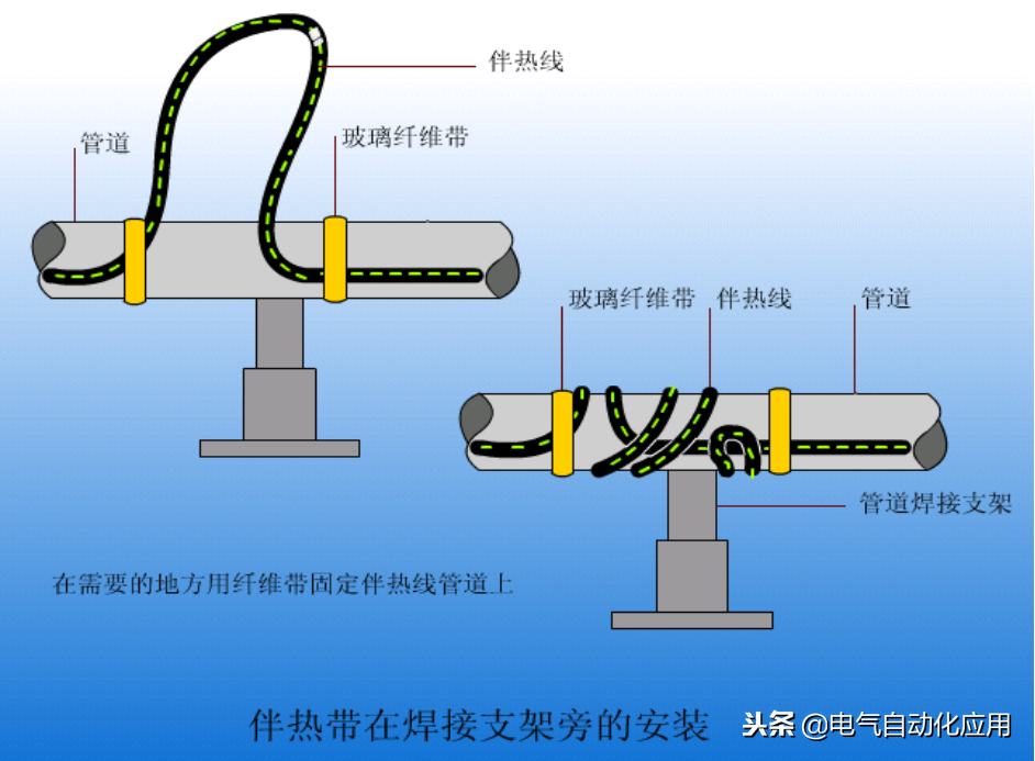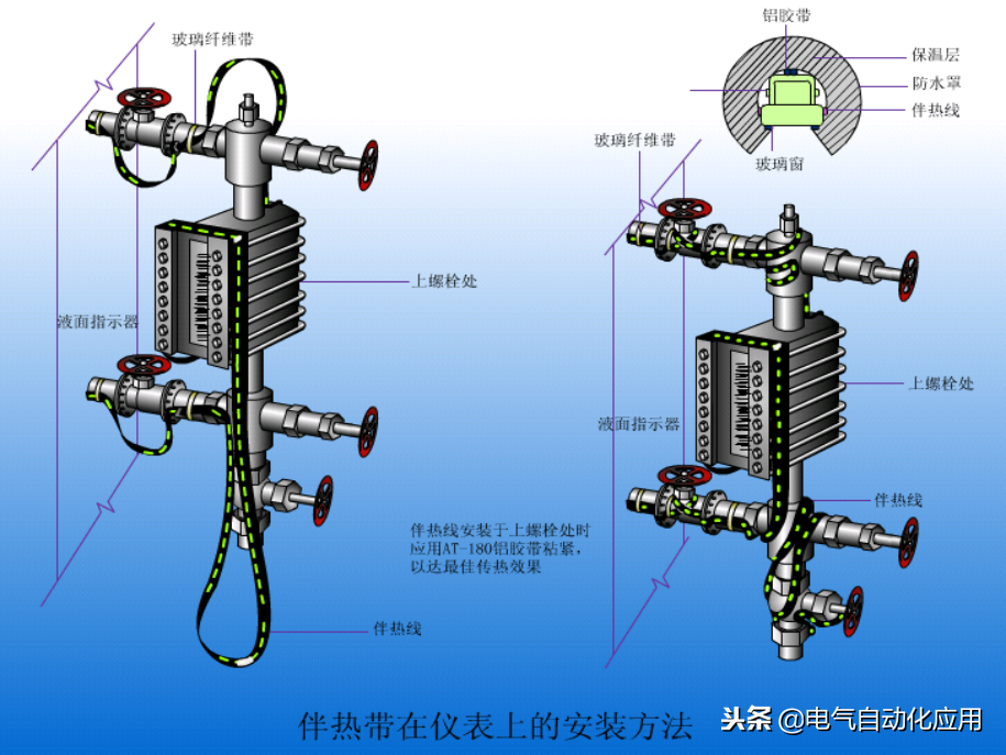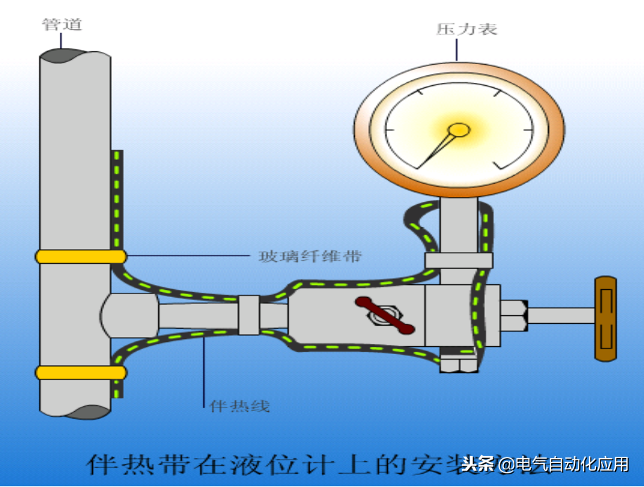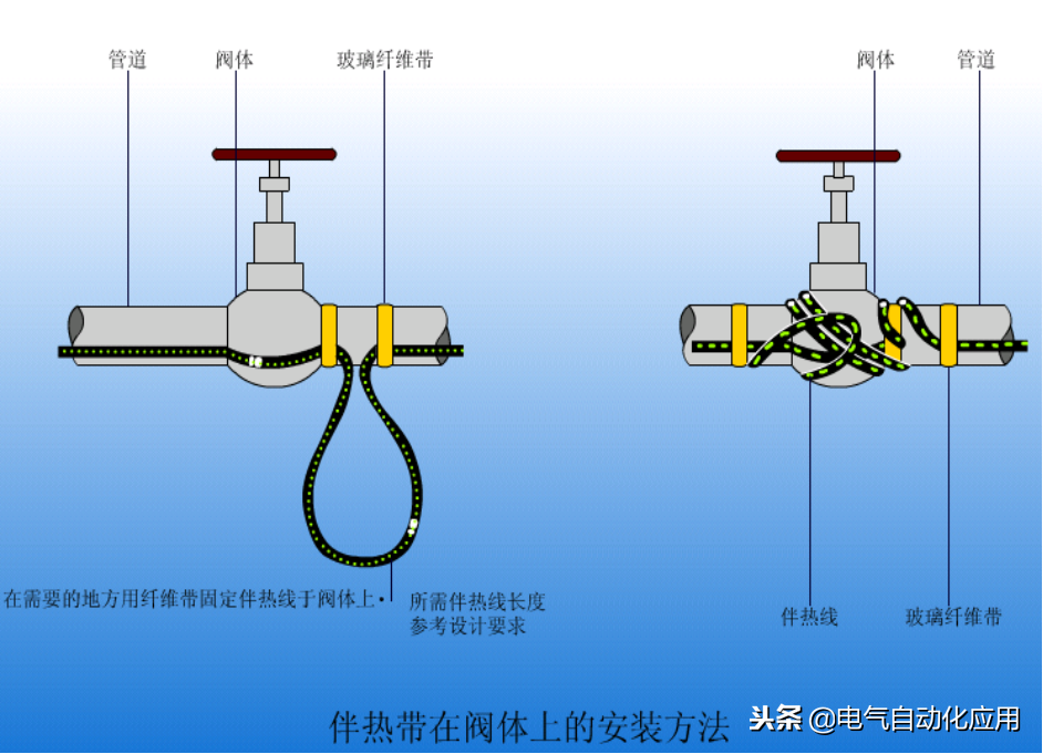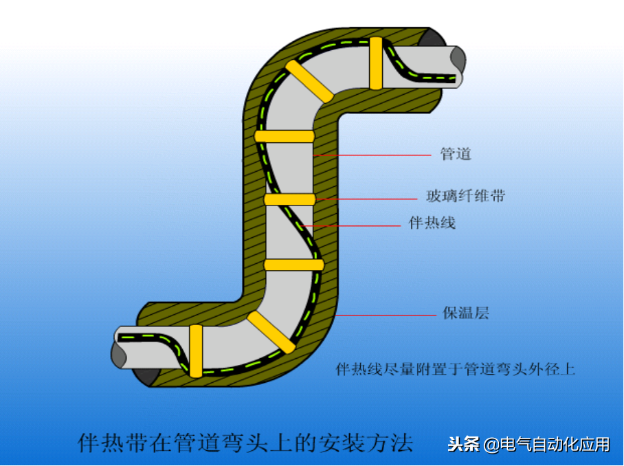 电伴热带的敷设要按一定的工艺要求进行。既要考虑到便于对电伴热带的检修,也要考虑到便于管线中阀体和液位计等可拆部件的修理和更换。图中给出了在各种情况下电伴热带的敷设图。