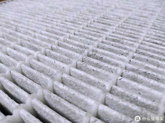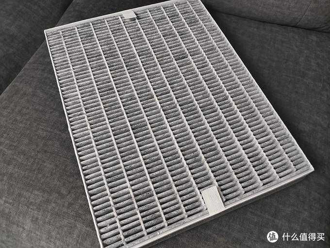 旧滤网自己曾经还拆解看过,基本为过滤网布夹着活性炭颗粒的构造,碳颗粒很小,号称甲醛的CADR值可以做的很高,活性炭的多孔构造比较适合甲醛等物质的吸附。