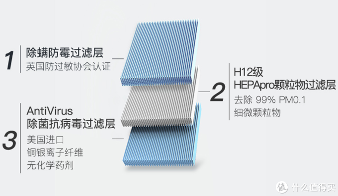 这款滤网表面跟原厂不一样,呈现的蓝色不仅仅是颜值,更在于滤网的三层构造,除了颗粒物过滤层,还特别加了防螨防霉层、除菌抗病毒层。