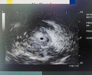 屠老伯因胸闷就诊,发现左侧大量胸腔积液收治我科,胸水反复送检仅见“少量腺样上皮细胞异形”,胸部CT提示“左侧胸腔积液,左侧支气管局部轻度狭窄,左肺局部实变不张,不排除肿瘤“。为尽早明确诊断,我们进行了电子支气管镜检查。然而,支气管管腔内并未见新生物、狭窄等,于是,我们用超声小探头一探究竟——超声小探头进入屠老伯左下肺背段的亚段支气管后缓慢移动,当细雪花样声像图中出现了岛屿样的轮廓时,我们知道已经缉拿到肿块了!顺利地进行了刷检、活检及灌洗后,屠老伯安返病房。