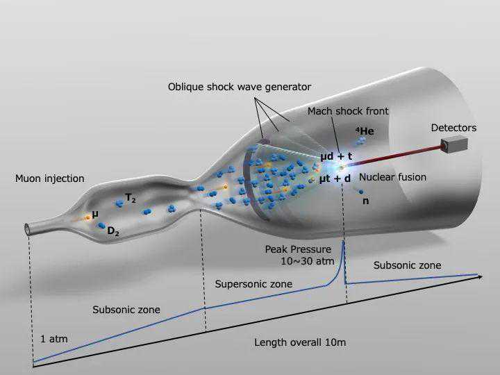 最近,日本科学家基于飞行缪子催化聚变(In-flightMuonCatalyzedFusion,IFMCF)提出了一种创新的紧凑型反应堆概念,其目的是通过提高聚变材料的密度来提高缪子平均催化次数。在拉瓦尔喷嘴(Lavalnozzle)中,由超音速流产生的马赫冲击波对氘氚混合靶进行空气动力学加压,形成高密度区域。缪子被注入到该区域,和氘氚形成dtμ分子,发生缪子催化的核聚变。