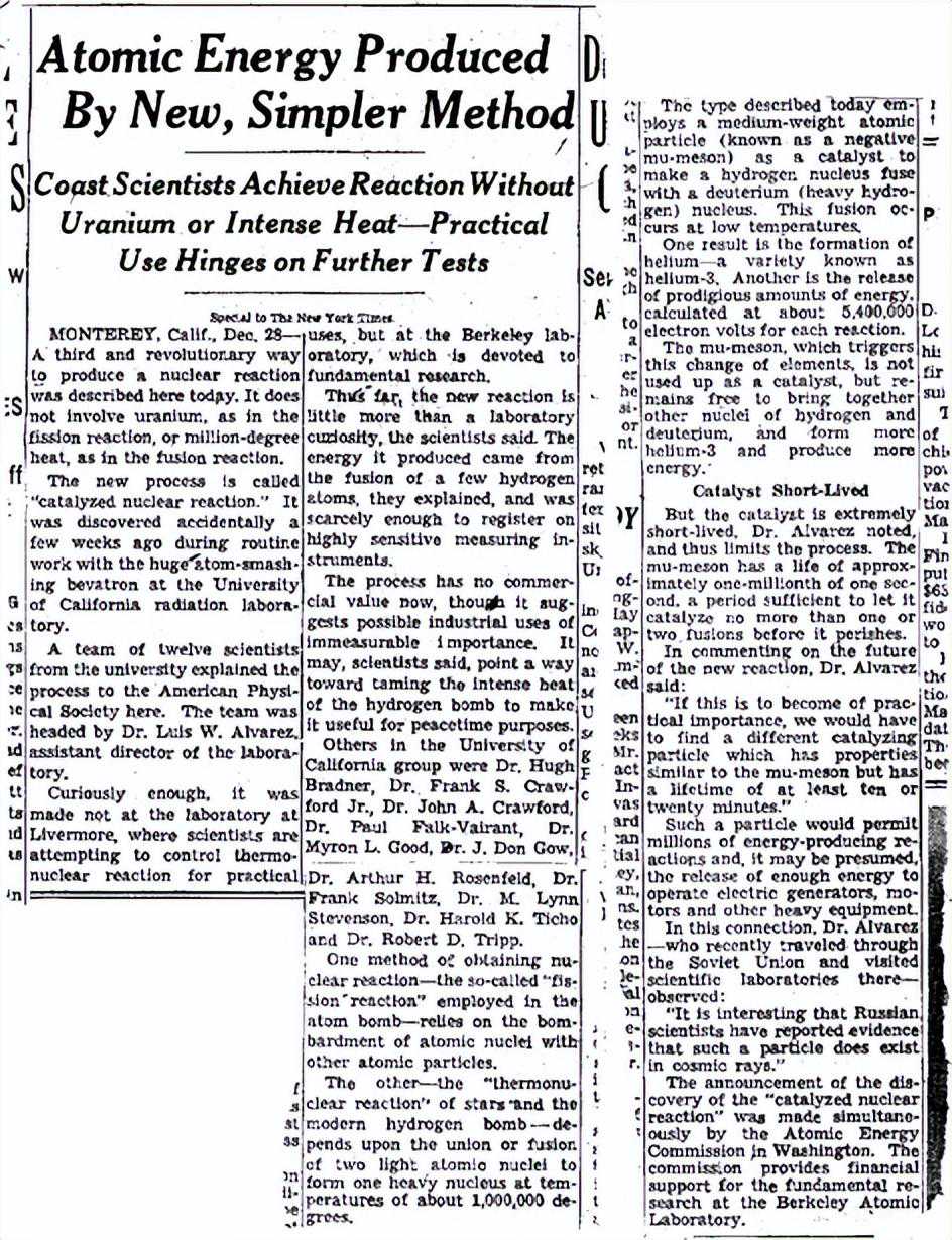 图1956年12月29日《》剪报,报道了实验中发现缪子催化的氢同位素聚变的消息。图源|《》