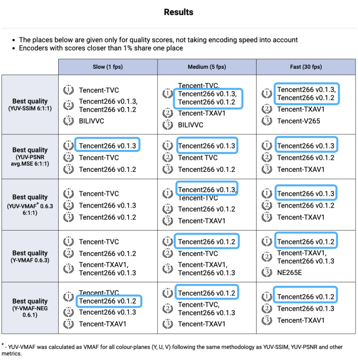 MSU大赛官网比赛结果,Tencent266各类编码器最多第一(15个指标12项第一)