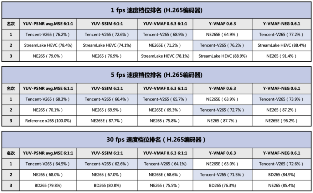 标准也是当今互联网应用的主流格式,腾讯通过对V265编码器直播和点播能力的持续优化,多年来在赛道一直保持行业领先。本次在赛道三个速度档位15项指标中,获得总计12项第一。以常用的YUV-SSIM指标为例,V265在1fps/5fps/30fps分别实现了相比%、33.6%和37.4%的码率节省。